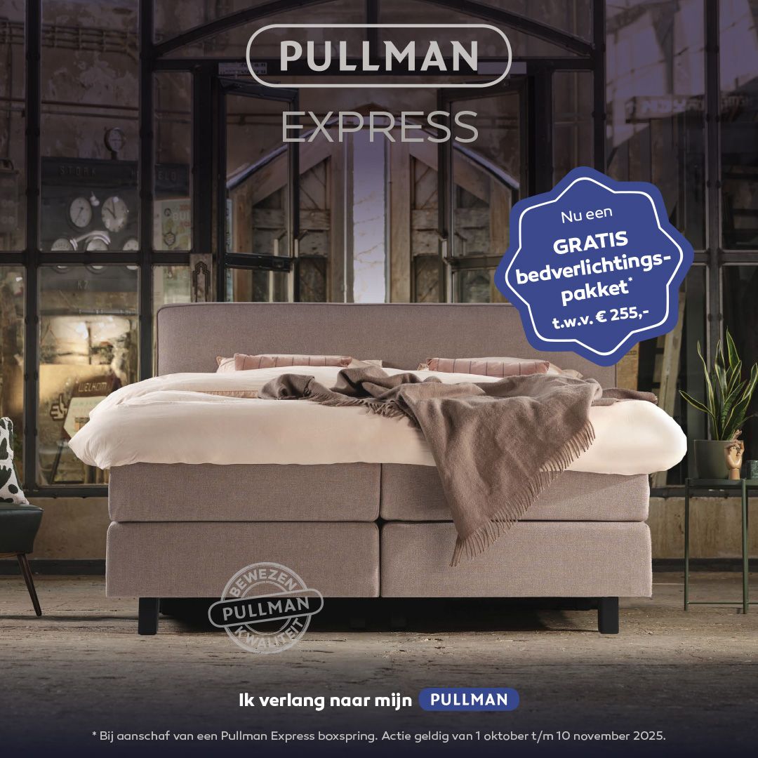 Ontvang bij aanschaf van een complete Pullman Express combinatie een bedverlichtingsset t.w.v. € 255,- cadeau, bestaande uit een private light voor onder de boxsprings en een set bedlampjes voor op het hoofdbord!